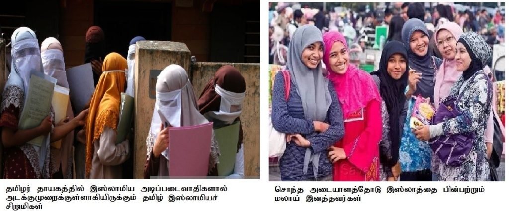 இசுலாத்திற்கு மதம் மாற்றப்பட்ட தமிழ்ப் பெண்கள் தமது இன அடையாளங்களை அழிக்காமல் வைத்திருந்தாலும் அண்மைக்காலமாக இசுலாமிய அடிப்படைவாதக் கும்பல்களால் பல அச்சுறுத்தல்களுக்கு உள்ளாகித் தங்களை அரபிகள் போல் உருமாற்றஞ் செய்ய வேண்டிய நிலை ஏற்பட்டிருக்கிறது. தமிழர் தாயகத்திலேயே தமிழினப் பெண்களுக்கு எதிராக மதவெறிக் கும்பல்களால் மேற்கொள்ளப்பட்டுவரும் காட்டுமிராண்டித்தனத்தைத் தட்டிக்கேட்க முடியாத அளவிற்குத் தமிழர்களின் அரசியல் பின்தள்ளப்பட்டிருக்கிறது.