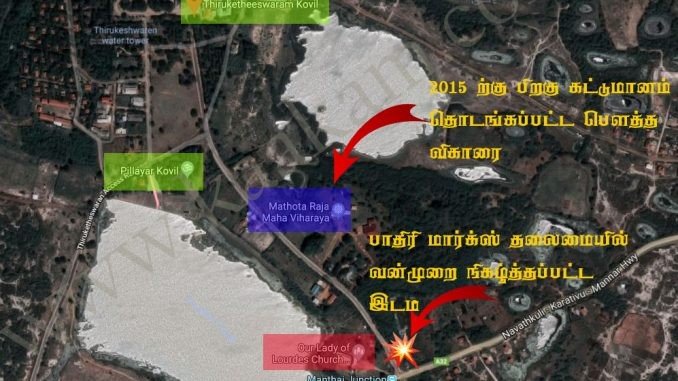 திருக்கேதீச்சரக் கோவில் முன்றலில் பெருந்திரளான சிவவழிபாட்டு மக்கள் ஒன்று திரளும் சிவராத்திரியை முன்னிட்டுத் துரித கதியில் அமைக்கப்பட்ட கோவில் நுழைவு வளைவானது மன்னார் புனித லூர்து அன்னை ஆலயப் பங்குத்தந்தை மார்க்சின் தூண்டுதலால் வங்காலையிலும் அதன் அயற் சூழலிலும் வாழும் கத்தோலிக்கம் தழுவியவர்களால் பிடுங்கி வீழ்த்தப்பட்டமையானது அடிப்படை நாகரீகத்திற்கே இழுக்கான எல்லை கடந்த கத்தோலிக்க மதஞ்சார்ந்த வன்மத்தைக் காட்டுகிறது. அத்துடன், அதற்கெதிராக எதிர்வினையாற்றுவது என்ற போர்வையில் “சிவசேனை” என்ற இந்திய அடிவருடி அமைப்பும் “விசுவ கிந்து பரிசத்” என்ற அகண்ட பாரதக் கனவுடன் இந்தியச் சந்தை மேலாதிக்க விரிவாக்கத்திற்காக அண்டை நாடுகளுக்குள்ளும் புகுந்து சூழ்ச்சிகளைச் செய்யும் கிந்துப் பயங்கரவாதக் கும்பலும் வெளியிட்ட அறிக்கைகளானவை தமிழர்களிடத்தில் அகமுரண்களைக் கூர்மைபெறச் செய்து கிந்திய ஊடுருவல்களைத் தமிழர்களிடத்தில் செய்யும் தமிழர்தாயகம் மீதான இந்தியத்தின் வன்வளைப்பு வேட்கையையும் எடுத்துக் காட்டுகிறது. மேலும், வத்திக்கானின் கண்ணசைவில் கட்டுண்டு கிடப்பதற்காக மிகவும் கட்டிறுக்கத்துடன் கட்டமைக்கப்பட்டிருக்கும் கத்தோலிக்கத் திருஅவையின் மன்னார் மற்றும் யாழ் மறைமாவட்டங்களின் அறிக்கைகளுக்கிடையில் இருக்கும் நேரெதிர் முரண்கள் கூட வத்திக்கானின் கொள்கைகளுக்கமைந்ததே என்பதைத் தெளிந்துகொள்வதற்கான நிகழ்வாகவும் இது அமைவதுடன் தமிழ்த்தேசியம் பேசுவதாகச் சொல்லிக்கொண்டு தமிழரின வரலாறு தெரியாமலும் காலவோட்டத்தில் தமிழர்களின் இறையியல் குறித்த பார்வை மாற்றத்தாலும், மாற்றாரின் ஆட்சியாலும் ஏற்பட்ட வேறுபட்ட மதங்களை (ஆசிவகம், சமணம், மகாசன பௌத்தம், சைவம்) வெவ்வேறு காலப்பகுதியில் தமிழர்களில் வெவ்வேறு பகுதியினர் பின்பற்றியமையின் பின்னணி குறித்து முறையான பார்வையற்ற தன்மையாலும் கண்டபடிக்குப் பொறுப்பற்றுக் கத்தோலிக்கம் தழுவிய தமிழர்கள் பற்றிய தரக்குறைவானதும் உண்மைக்குப் புறம்பானதுமான தூற்றல்களைக் கத்தோலிக்கம் சார்ந்த மதவெறிக்கெதிரான தமது எதிர்வினையாக ஆற்றியவர்களின் சிறுமையுமென பலவற்றை இனங்காணக் கூடிய நிகழ்வாகவும் இந்த மதவெறி நிகழ்வை நாம் நோக்க வேண்டியிருக்கிறது.