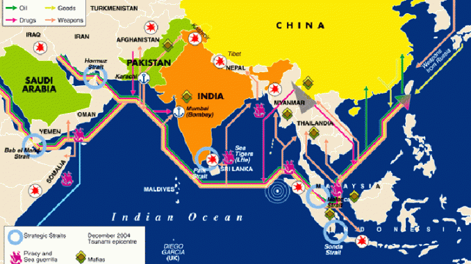 எல்லைச் சிக்கலாகச் சொல்லப்பட்டு 1962 இல் நடந்தேறிய சீன- இந்தியப் போரிற்கான மெய்க் காரணமே சீனாவின் மலாக்கா நீரிணையூடான கப்பற் போக்குவரத்தில் ஏற்பட்ட குறுக்கீடுகள் தான். இதனால் சீனாவானது இந்துமாகடலில் உள்ள துறைமுகங்களின் திருத்தல் மற்றும் விரிவாக்கப் பணிகளைச் செய்வதில் முழு மூச்சாக இறங்கியுள்ளது. இதற்கான வாய்ப்பு எங்கு கிடைக்கிலும் அங்கு ஒரு ஒப்பந்தத்தைப் போட்டு வேலையைச் சீனா தொடங்கிவிடுகிறது. அந்தமான் தீவுக் கூட்டத்திற்கு மிக அருகாமையிலுள்ள மியான்மாருக்குச் சொந்தமான கொகோ தீவானது கண்காணிப்புத்தளம் அமைப்பதற்காக சீனாவுக்கு 1994 ஆம் ஆண்டில் குத்தகைக்கு வழங்கப்பட்டது.